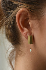 Brass earring studs with a chain handing off with a opal and pearl bead attached.