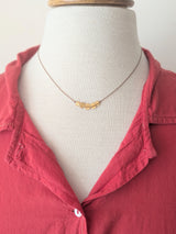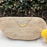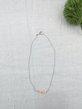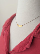 Expertly handmade golden coins knotted on taupe nylon. 24 karat over sterling silver, designed to form a time worn patina as a relic. Mother of pearl flower button closure. 16"