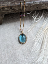 A faceted blue fluorite pendant on a resistant beige coloured thread, strewn with blue sapphire and zirconium beads.