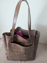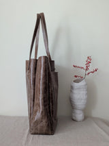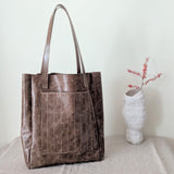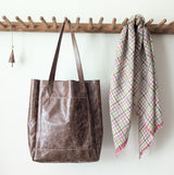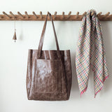New! Large vertical tote with with one big outside pocket and an even larger inside pocket. We added stitching details to make it unique - vertical lines run through the front pocket and the sides giving it an interesting texture. The soft cow leather comes from Italy and has a vintage yet shiny finish. The finished bag weighs about 0.8lbs hence barely adds any weight to your load.