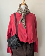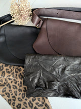 Slim and stylish small messenger bag made of soft washed leather with a cool wrinkled finish. A large open outside pocket on the back of the bag will hold your phone (4.25" h x 7.25) plus one inside pocket.  Adjustable leather strap with solid brass buckle.   We kept the raw edge of the hide on this design so the flap edge will vary, each bag is unique.
