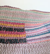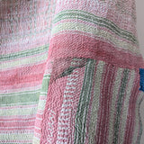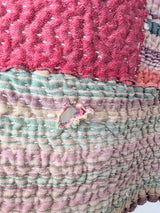 This particular kantha features stripes and patchwork in pink, green, navy blue, and other colors.