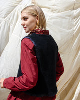 Fluffy and a bit stretchy wool v-neck vest top, made with a wool mix and lined with silk cotton satin. The lining is cut bigger than the fluffy so that it pokes out and reveals a ruffle like edge. Great to layer over the Sula silk mesh top (sold separately) or your favorite shirt.