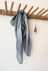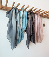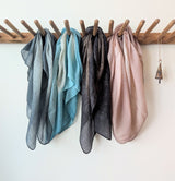 Muse is lighter than a feather and softer than a kiss. It is designed to carry you from early spring through late autumn. Hand-dyed in a soft sage tone, it creates gentle, natural variations and arrives with an embroidered storage pouch.