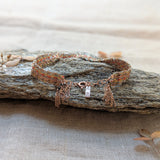 Woven bracelet made of rose gold-finished fine sterling silver chains and grey, pink, orange, and blue silk yarn. A piece of jewelry with a refined and sophisticated style that transcribes the codes of luxury craftsmanship.
