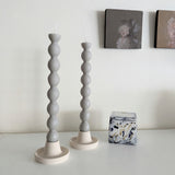Set of two cute wavy taper candlesticks in the color natural, perfect for adding some fun to your home decor! Unscented. Comes in a little box tied with ribbon.