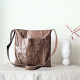 Large, lightweight, carryall leather bag in a simple shape with all the functionalities: two large pockets (including a zippered one inside), a key strap, an adjustable strap that allows you to wear the bag over the shoulder as a hobo or as a cross body bag. A deep gusset allows you to fit a lot. Zipper closure.