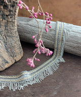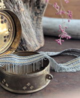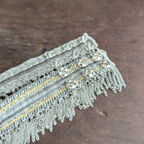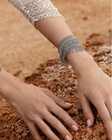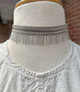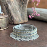Double wrap bracelet in brass with a gold and antique silver finish, composed of a metallic silver textile ribbon embroidered with fine chains. A fringe of refined chains completes the look of the bracelet, which can eventually be worn as a choker. An easy-to-wear piece of textile jewelry.