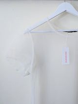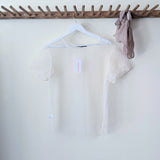 Sheer tulle shirt by German Designer Susanne Bommer. It has a boxy silhouette and round neckline. The white tulle allows for pieces layered under to pop. Made in Poland