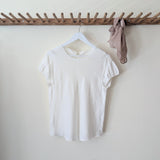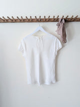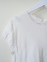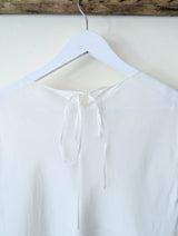 This lightweight silk blouse is by German label, Susanne Bommer. It features short sleeves with a slight puff and gathered hem and a thin ribbon tie at the back neckline. Great to layer with a camisole underneath or layered over for chilly spring days. Made in Poland