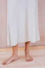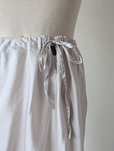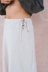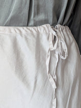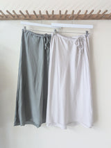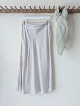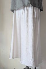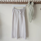 Bias silk skirt is calf length cut on the bias from silk cotton satin. The bias cut skirt has a drawstring tie, making the waist adjustable. The tie emerges on the right side of the front waistband, reducing bulk at the front. Tt has a raw hem with a stitch line. bias cut skirt is cut from washable and comfortable silk cotton satin.