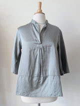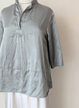 Satin sunny blouse is a long easy blouse. Hip length with 3/4 length sleeves and a panel on the front and back. There is a hand stitched tab on the front opening.
