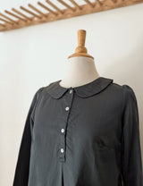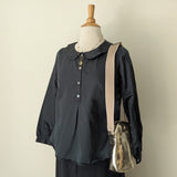 This lovely dark green blouse is made of a shiny silk cotton satin. It features a round Peter pan collar, buttoned sleeves, darts at the bust, and buttons that go halfway down the front.